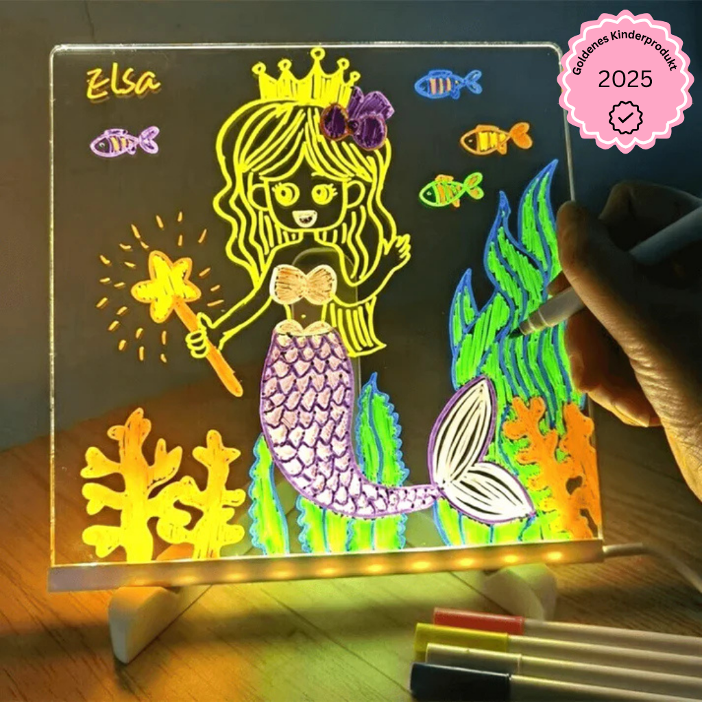 Die LED-Beleuchtung wird über einen kleinen aktiviert. Sie leuchtet sanft und sorgt für ein magisches Zeichenerlebnis – ganz ohne grelles Licht.